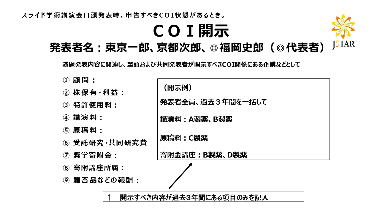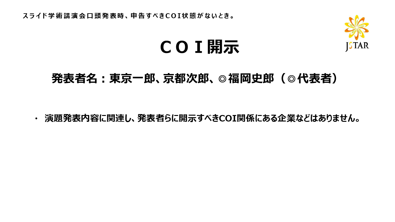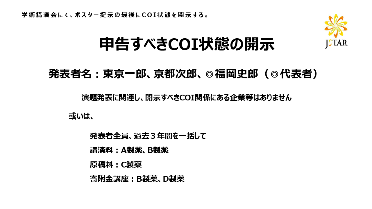 口演発表では下記ひな形(例)に準じたスライドを講演時の2枚目に呈示した上で、利益相反状態の有無を述べて下さい。 ポスター発表では利益相反状態に応じて、下記ひな形(例)に準じたものを発表ポスターとともに掲示して下さい。